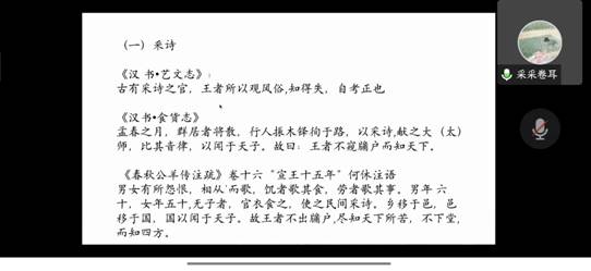 李雪莹老师以“从诗到《诗经》”为主题引经据典,介绍了采诗、献诗与作诗,以及诗的四个发展阶段:“四术”造士、《诗》以导德、言语引诗和外交赋诗。最后对孔子留下的相关文本以及礼乐崩坏的大背景进行了详细分析。