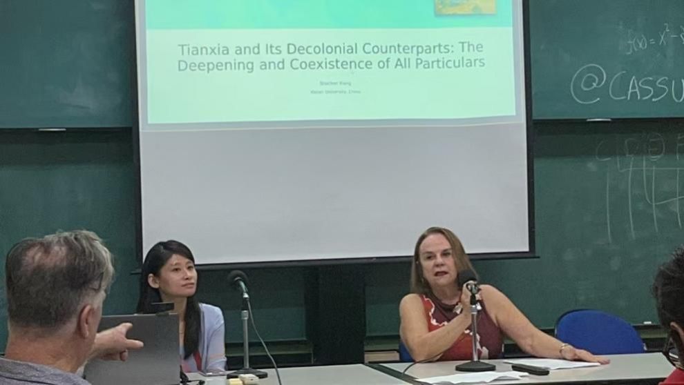 大会首先以中国社会科公司赵汀阳教授的报告“天下的当代性:世界秩序的实践与想象”开启了第一段议程。他认为应该从中国古典哲学的概念参照出发,与现代性的关键问题展开对话,在不忽视西方哲学的情况下,以自己的历史哲学为参考去探讨政治、伦理、科技、逻辑和身份问题的原初可能性。项舒晨教授对这一主题给予了回应,指出天下体系的成功不能仅仅诉诸于人们的理性,并作了题为 “天下及其去殖民化的对应物:万殊的深化与共存(Tianxia and Its Decolonial Counterparts: The Deepening and Coexistence of All Particulars)”的主题报告。她提出,中国的世界主义不同于主流的自由多元文化主义(liberal multiculturalism)范式,它对于不同文化的发展不仅停留在包容层面,也即仅仅允许不同文化存在而已,而是应该使不同的文化在交流和碰撞中互相学习、相互互补、融合、进而达到共识。
