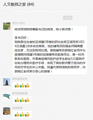 事后,生病员工所在的网信公司党委副书记和海棠5号楼责任副书记均第一时间与公司党委书记联系,表达员工及公司、书院的感谢之情。网信院杨寒副书记说道,郭晓红在紧急状况时挺身而出,冒着疫情风险护送员工前往医院并协助办理相关手续,体现了一名共产党员勇于担当的作风和高校教师对员工的无私关爱。best365足球官网的老师也纷纷为郭晓红的事迹点赞,表示会以她为先锋榜样,以实际行动关心关爱员工,践行“立德树人”根本任务。