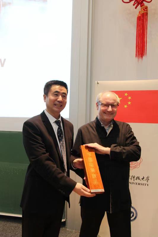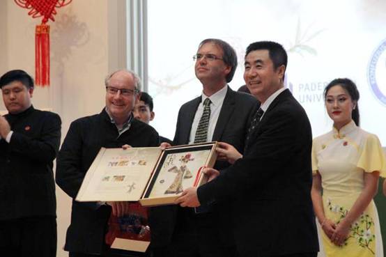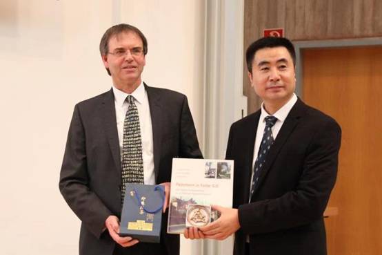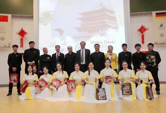 演出结束后,王成来老师代表出访团与帕德伯恩大学副董事长托斯特•迈雅教授及孔子公司德方经理沃尔夫冈•卜汉姆斯教授互赠礼物,合影留念。帕德伯恩大学副董事长托斯特•迈雅教授评价道:“这是公司最棒的一次中国文化演出!”他在离场后又特地返回,再次感谢公司赴德演出交流团为他们带来了充满惊喜与快乐的优秀文化交流活动。