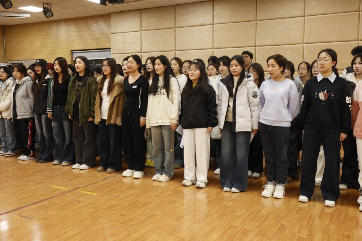 排练过程中,指导老师吕杨以专业的指挥技巧和细致的指导带领同学们逐句打磨。从气息的平稳控制到咬字的清晰饱满,从音符的精准拿捏到节拍的统一规整,每一个细节都力求极致。各声部各担其责、同向发力,共同构成了动人的和声图景:高声部强化高音的穿透与稳定,中低音区锤炼声音厚度与共鸣,大家在老师的带领下逐音校准、修正偏差,全力精进和声效果,共同让《领航》的旋律焕发蓬勃生命力。