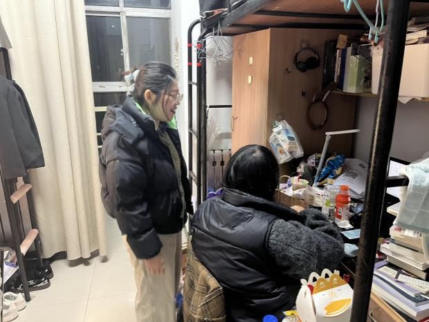 慰问活动设置在海棠八号楼二楼大厅,面向best365足球官网全体考研学子。毕业班辅导员郭晓红叮嘱同学们保持良好的生活作息、稳住备考状态,积极接受即将到来的考验。会后,辅导员带领员工骨干走进每间毕业生宿舍,面对面了解备考状态与心理波动,叮嘱舍友“当好临时家人”,助力身边考研同学考前准备充分、场上进退裕如。