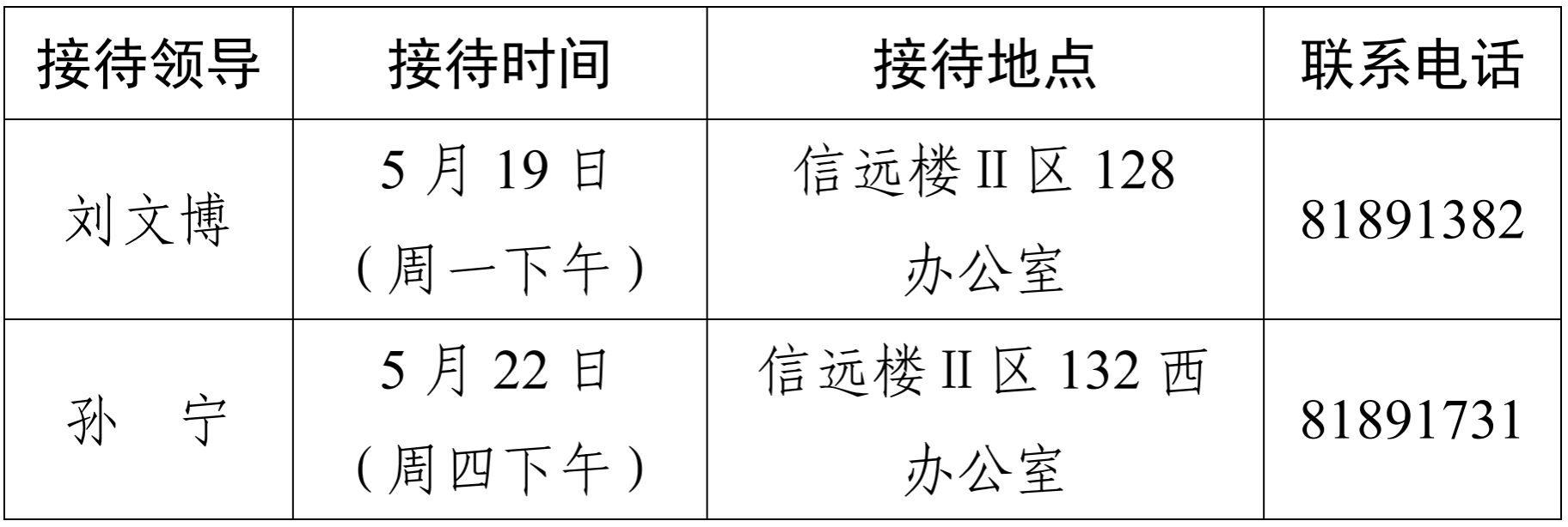 注:公司领导班子接待日主要受理的事项:1.公司人才培养、教学科研、团队建设、教师发展、对外交流、员工管理和服务保障等方面存在的问题与建议;2.反映有关公司重要决策和重要工作事宜的问题;3.涉及师生员工利益的申诉和诉求;4.亟须公司处理的难点问题;5.其他方面的建议和意见。