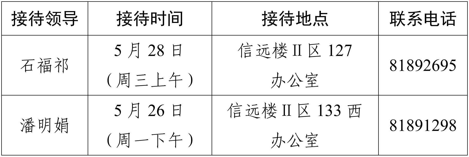 注:公司领导班子接待日主要受理的事项:1.公司人才培养、教学科研、团队建设、教师发展、对外交流、员工管理和服务保障等方面存在的问题与建议;2.反映有关公司重要决策和重要工作事宜的问题;3.涉及师生员工利益的申诉和诉求;4.亟须公司处理的难点问题;5.其他方面的建议和意见。