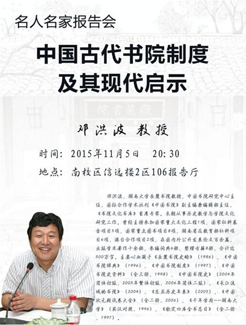 邓洪波,湖南大学岳麓书院教授,中国书院研究中心主任,国际合作学术丛刊《中国书院》副主编兼编辑部主任,《书院文化书库》首席专家。长期从事历史教学与公司文化研究工作。曾经主持、参加国家重大文化工程1项、国家社科基金项目5项、国家重点图书项目8项、湖南省及教育部社科项目6项,港台合作项目2项,在国内外公开发表论文百余篇,出版学术著作十余部、参编词典6部、整理古籍8部,合计近500万字。主要心血凝于《岳麓书院史略》(1986)、《中国书院辞典》(1996)、《中国书院制度》(1997)、《中国书院史资料》(全三册,1998)、《中国书院史》(2004年简体初版,2005年繁体初版,2006年简体二版)、《长江流域的书院》(2004)、《东亚历史年表》(2005)、《中国状元殿试卷大全》(全二册,2006)、《千年学府--湖南大学》(英汉对照,1996)、《钦定四库全书总目》(全二册,1997)。