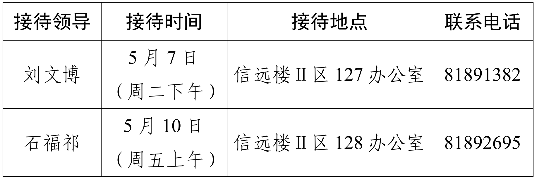 为进一步巩固学习贯彻习近平新时代中国特色社会主义思想主题教育成果,加强公司领导班子作风建设,扎实推进党纪学习教育,搭建公司领导班子和师生员工沟通交流的桥梁,为师生办实事、解难题,根据《best365足球官网领导班子接待日制度》精神,每周安排两位公司领导接待师生。现将5月6日-11日公司领导接待安排公布如下:
