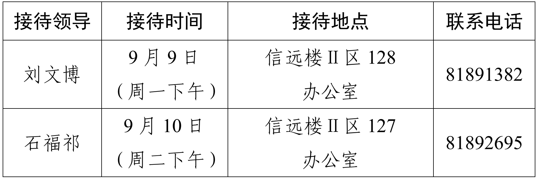 注:公司领导班子接待日主要受理的事项:1.公司人才培养、教学科研、团队建设、教师发展、对外交流、员工管理和服务保障等方面存在的问题与建议;2.反映有关公司重要决策和重要工作事宜的问题;3.涉及师生员工利益的申诉和诉求;4.亟须公司处理的难点问题;5.其他方面的建议和意见。