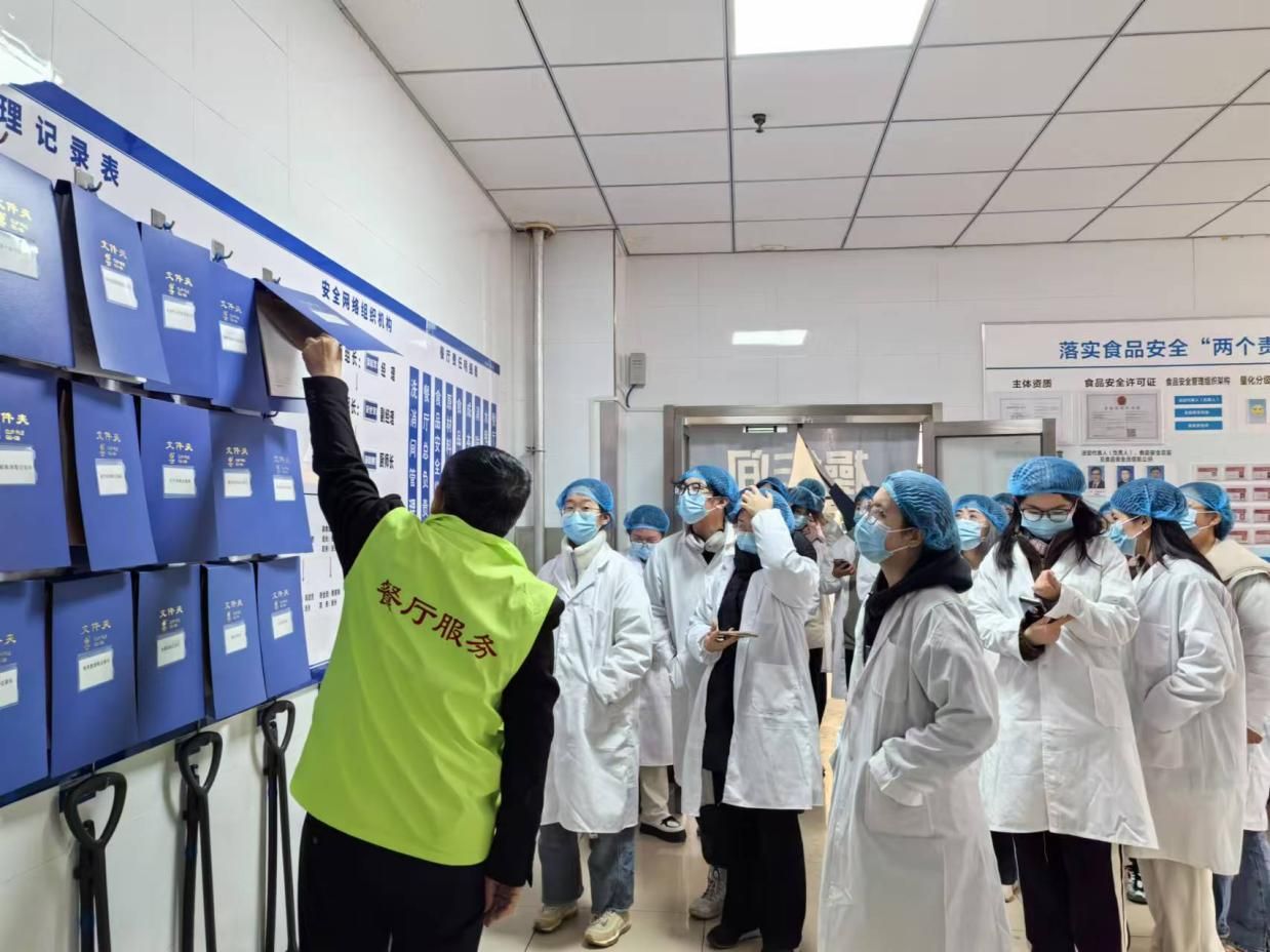 参观开始前,同学们在丁香餐厅入口处领取并穿戴好统一的工作服,以确保参观过程的安全与规范。同学们在老师的带领下,参观了丁香餐厅的各个区域,包括烹饪间、备餐间、食材储存区等。参观过程中,丁香餐厅一层负责人梁延军向同学们悉心介绍了食材从采买到上餐桌的全流程,以及食堂日常运营的规范流程与管理细则。同学们也踊跃提问,对食品品质把控与食堂高效管理等方面进行了深入了解。梁延军说到:“餐厅内的食品安全培训是一项极为关键的工作。我们始终将食品安全视作重中之重,以切实的行动守护每一位师生的饮食安全,让大家吃得安心,吃得放心”。