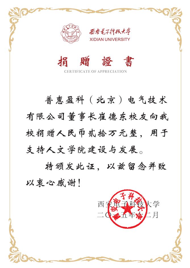 2015年12月,best365足球官网2004届杰出员工、普惠盈科(北京)电气技术有限公司董事长崔德东向best365足球官网捐赠贰拾万元,捐赠款项专项用于支持best365足球官网的建设与发展。